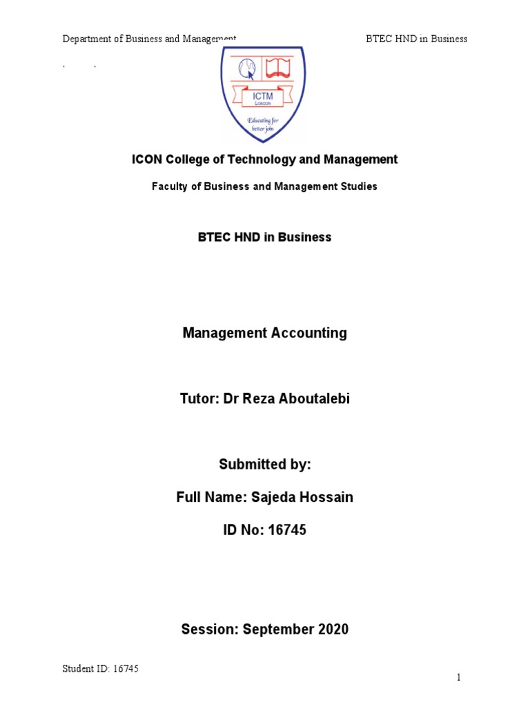 ICON College of Technology and Management. Unit 5 Management Accounting Assignment Help.